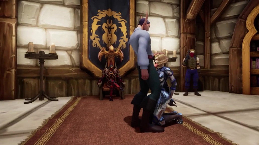 The king enjoys the night's entertainment as a couple has sex for the King. An Elf and a human girl are having standing blowjob, standing sex, and missionary with her legs spread open in the throne room.